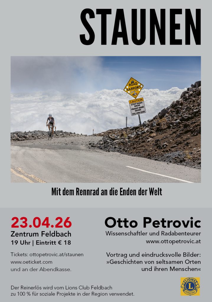 Am 23.04. tritt der renommierte Wissenschaftler und Radabenteuer und Otto Petrovic im österreichischen Feldbach auf, um unter dem Motto »STAUNEN – Mit dem Rennrad an die Enden der Welt« (zugleich auch der Titel seines herausragenden, soeben im Covadonga Verlag erschienenen Text-Bild-Bands) von seinen Fahrrad-Expeditionen durch inzwischen 43 Länder auf fünf Kontinenten zu berichten: Die Zuhörerinnen und Zuhörer dürfen sich auf viele fesselnde Geschichten vom Radfahren auf legendären und unbekannten Routen, von der Vielfalt der Kulturen und von bewegenden Begegnungen mit erstaunlichen Menschen freuen. Und natürlich auf eine Menge echt starker Fotos.